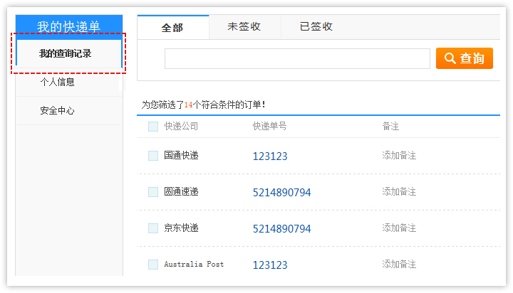 2、用戶中心點(diǎn)擊【我的查詢記錄】,進(jìn)入我的快遞單查詢記錄頁(yè)面,即可對(duì)曾查詢過(guò)的快遞單進(jìn)行搜索與查看。