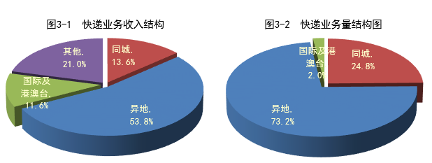 1月,同城、異地、國際及港澳臺快遞業務收入分別占全部快遞收入的13.6%、53.8%和11.6%;業務量分別占全部快遞業務量的24.8%、73.2%和2.0%。與去年同期相比,同城快遞業務收入的比重上升0.2個百分點,異地快遞業務收入的比重下降2.9個百分點,國際及港澳臺業務收入的比重下降了2個百分點。