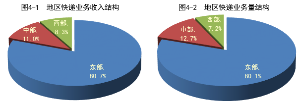 1月,東、中、西部地區快遞業務收入的比重分別為80.7%、11%和8.3%,業務量比重分別為80.1%、12.7%和7.2%。與去年同期相比,東部地區快遞業務收入比重下降了1.1個百分點,快遞業務量比重下降了1.6個百分點;中部地區快遞業務收入比重上升了0.9個百分點,快遞業務量比重上升了1.4個百分點;西部地區快遞業務收入比重上升了0.2個百分點,快遞業務量比重上升了0.2個百分點。