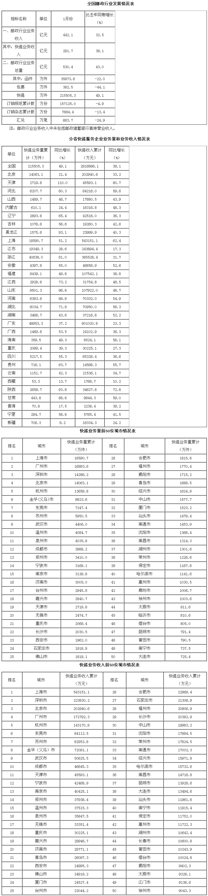 1月,郵政企業和全國快遞服務企業業務收入(不包括郵政儲蓄銀行直接營業收入)完成442.1億元,同比增長32.5%;業務總量完成530.4億元,同比增長43%。