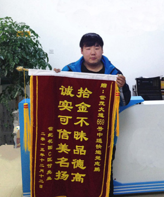 12月20日,一面寫有“拾金不昧品德高 誠實可信美名揚”字樣的錦旗被送到了中通快遞哈爾濱江北大學分部,失主對該分部快遞員楚志鵬無償歸還丟失錢物的行為再三表示感謝。