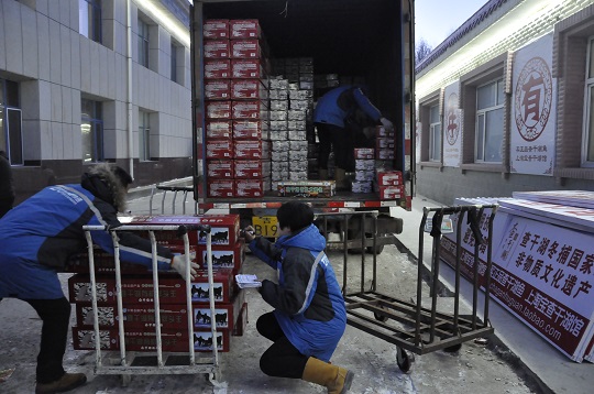 查干湖冬捕,即查干湖冬季冰雪漁獵,是一種極其傳統的漁業生產方式,始于史前、盛于遼金,延續至今千年未變,當地漁民被稱為“最后的漁獵部落”。12月末到春節前是查干湖冬捕的黃金時間,漁民借助馬拉絞盤的力量在冰下行網捕魚,其盛大的場景每年都吸引著數萬國內外游客前來觀看。2011年,中通吉林松原公司開通了查干湖承包區,推出了“大美查干湖、中通鮮到家”的宣傳口號,并自行購置加厚紙箱、保溫箱等專業包裝材料,為寄遞客戶提供免費包裝服務。如今,查干湖分部承包區日發件量500票以上,名列松原公司首位,也為查干湖魚的對外銷售打開了一條新通道。
